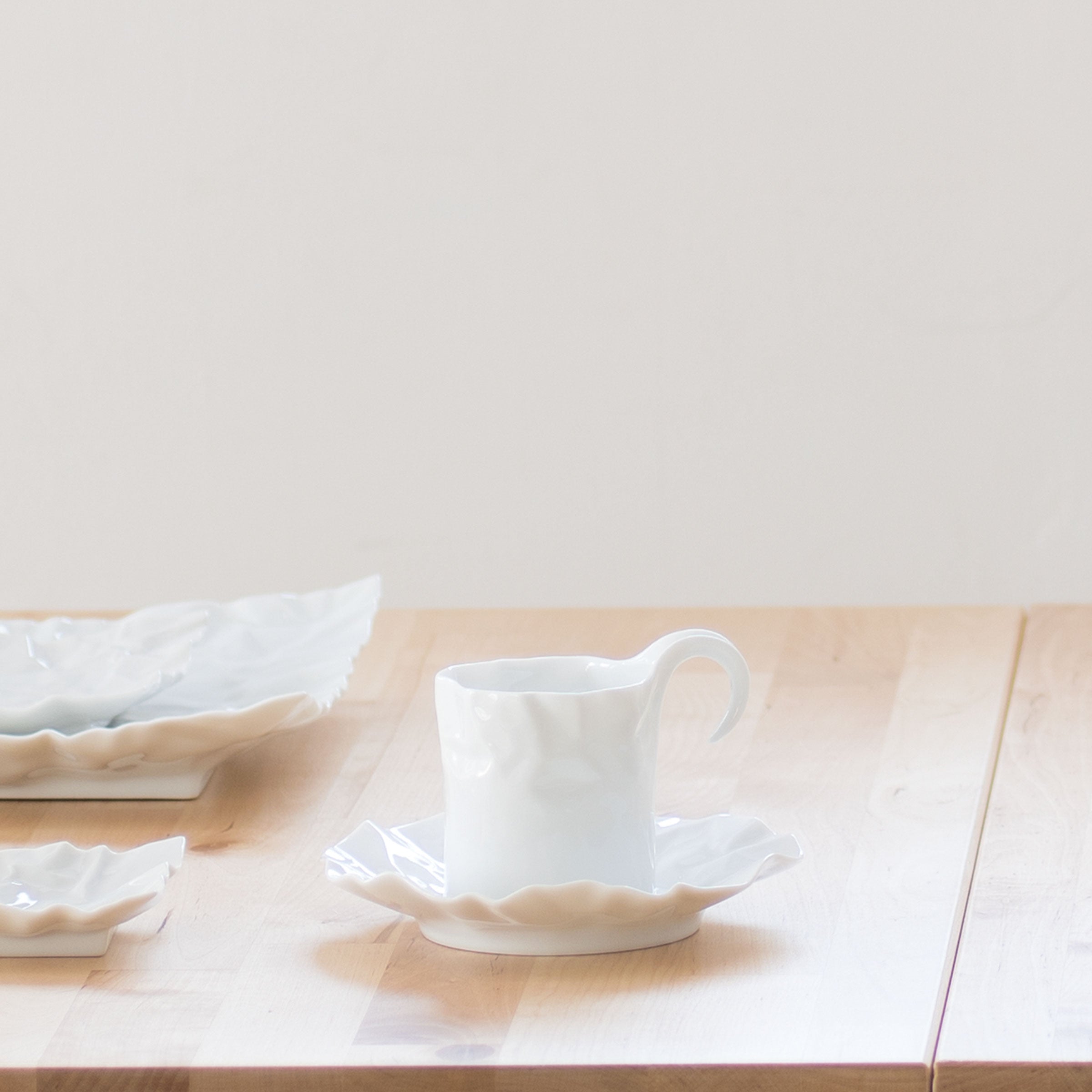 Elegant yet subtly expressive, this porcelain cup and saucer set by Makoto Komatsu features a relief pattern inspired by crumpled paper, a signature of the Crinkle series. The delicate texture along the rim adds a subtle yet distinctive visual interest, balancing minimalist simplicity with sculptural boldness. The cup’s handle flows seamlessly into the body, creating an elegant and harmonious silhouette.