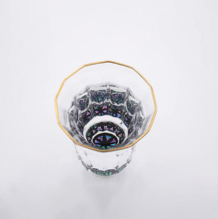 Each piece weaves together the delicate art of Raden glass and Takaoka lacquerware—a traditional Japanese craft. Shimmering shells are meticulously inlaid by hand and sealed with lacquer, transforming every glass into a one‑of‑a‑kind artisan masterpiece. Crafted with 12 delicate facets and an iridescent abalone inlay, each sip reflects a kaleidoscope of colors. The refined gold rim adds a subtle touch of luxury, harmonizing tradition and modern design.