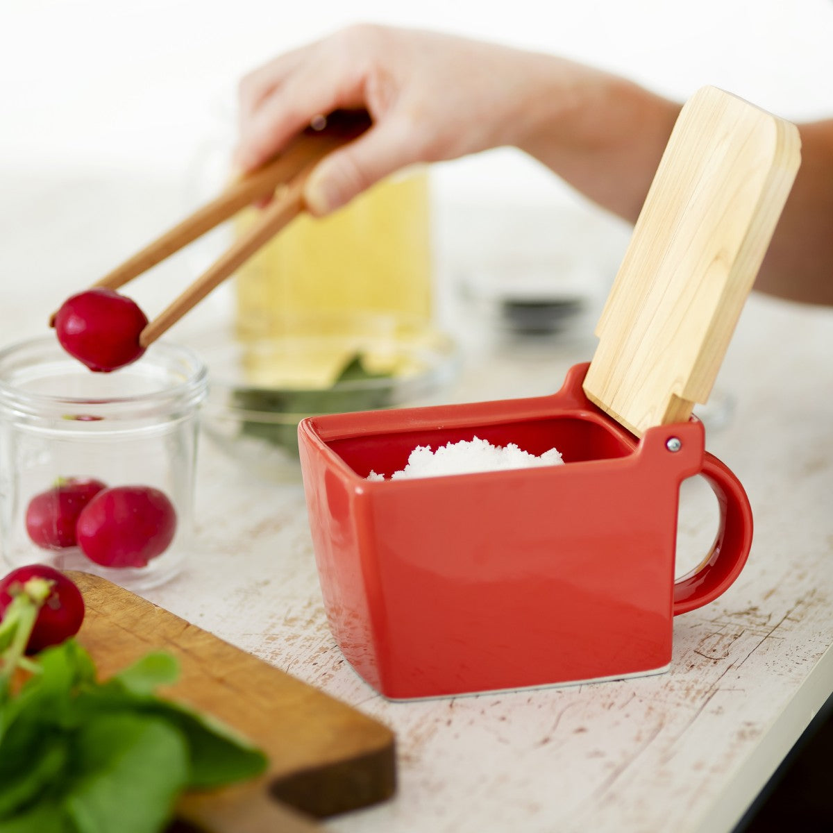 Our comfortable carry-handle will let you maneuver with one hand with ease when seasoning your traditional dish or salting a pot of boiling water (in a hurry!). With the attached flip-lid, you never have to accidentally lose it or leave the salt exposed to moisture and food debris. Its intricate design is completed by its ability to save space: stack our Hinoki saltbox! We promise: our saltbox’s perfect minimalist design will be a flattering addition for any home.