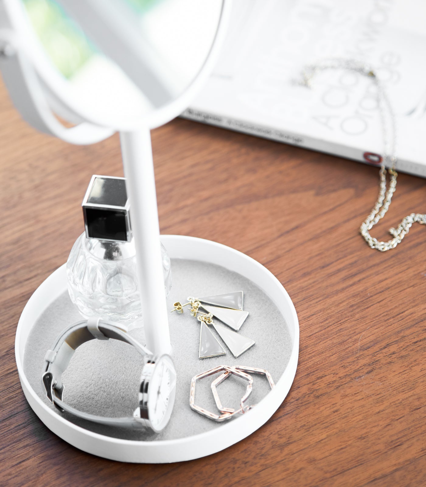 Check out your look in the 360-degree mirror while getting ready. Not vibing with your earrings? Simply switch them out and store them in the bottom tray which is perfect for holding tiny trinkets.