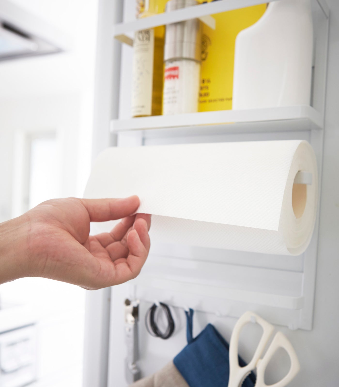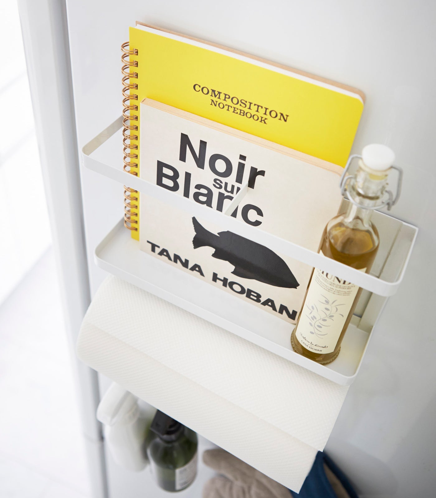 Put that fridge to *work*! A blank fridge is a missed opportunity! This simple, functional kitchen rack puts this under-utilized surface to good use by keeping frequently used items off of the counter, yet quickly accessible. Attach the strong magnet to your fridge in seconds and start piling on everything from paper towels to pot holders and hanging utensils. Your most-used items, within handβs reachβnow thatβs convenient.