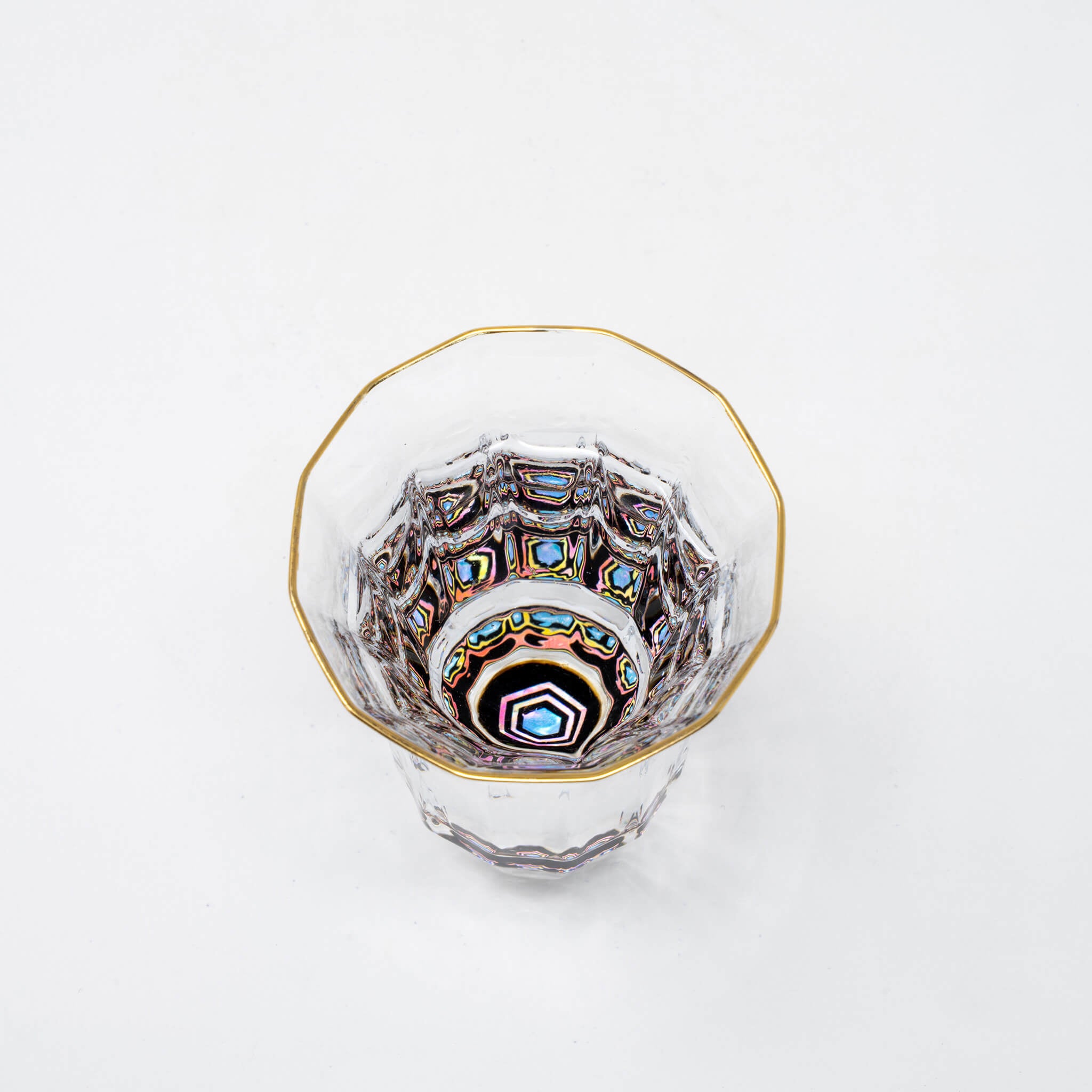 The Kaleidoscope Abalone Glass Gold-Rimmed Cup seamlessly enhances upscale bar or dining spaces with its luxurious shine and refined quality. Designed to complement finely crafted cocktails and premium spirits, this cup enriches both flavor and ambiance, adding a touch of elegance to any extraordinary setting. Its shimmering facets and intricate abalone inlay bring unparalleled sophistication, creating a memorable drinking experience in high-end environments.