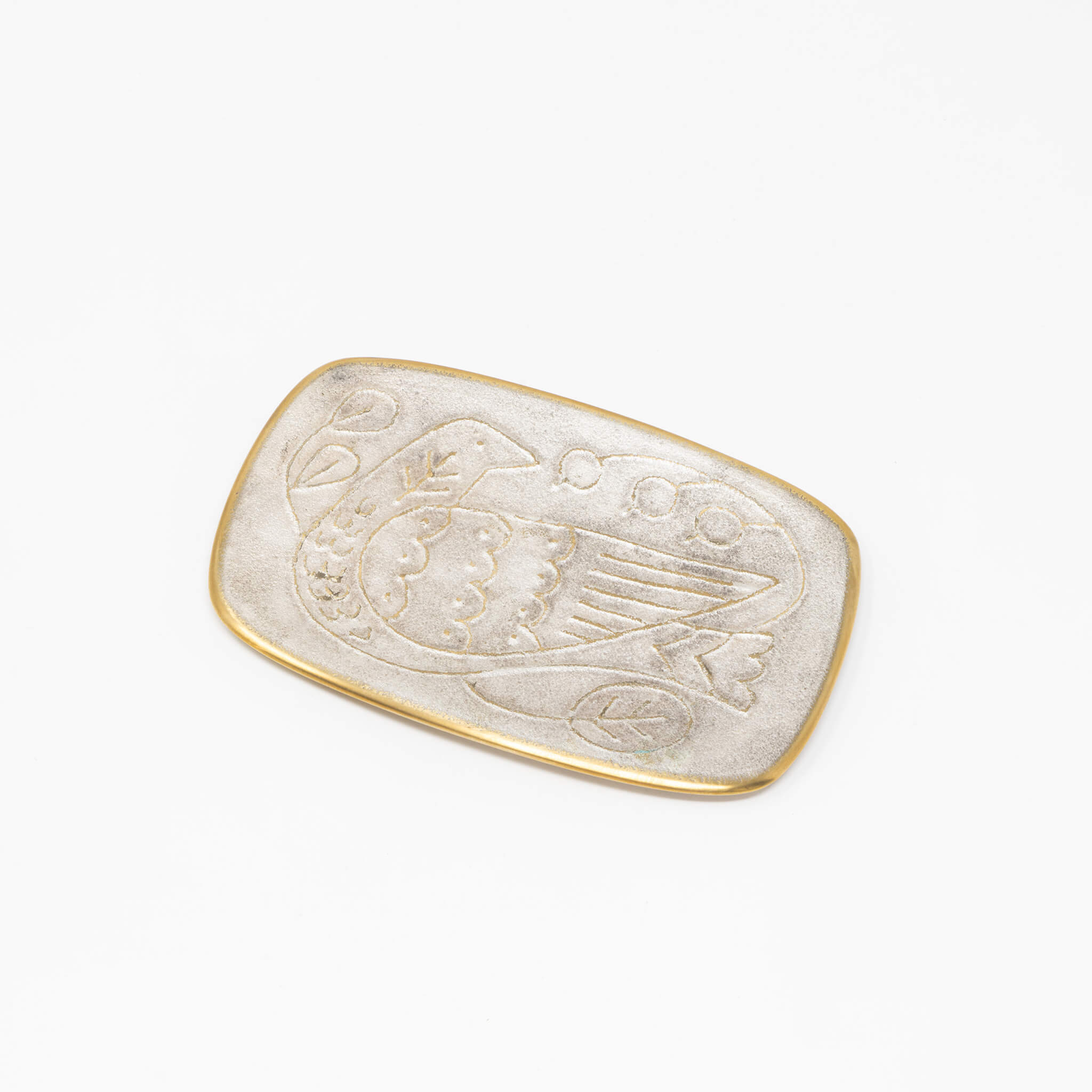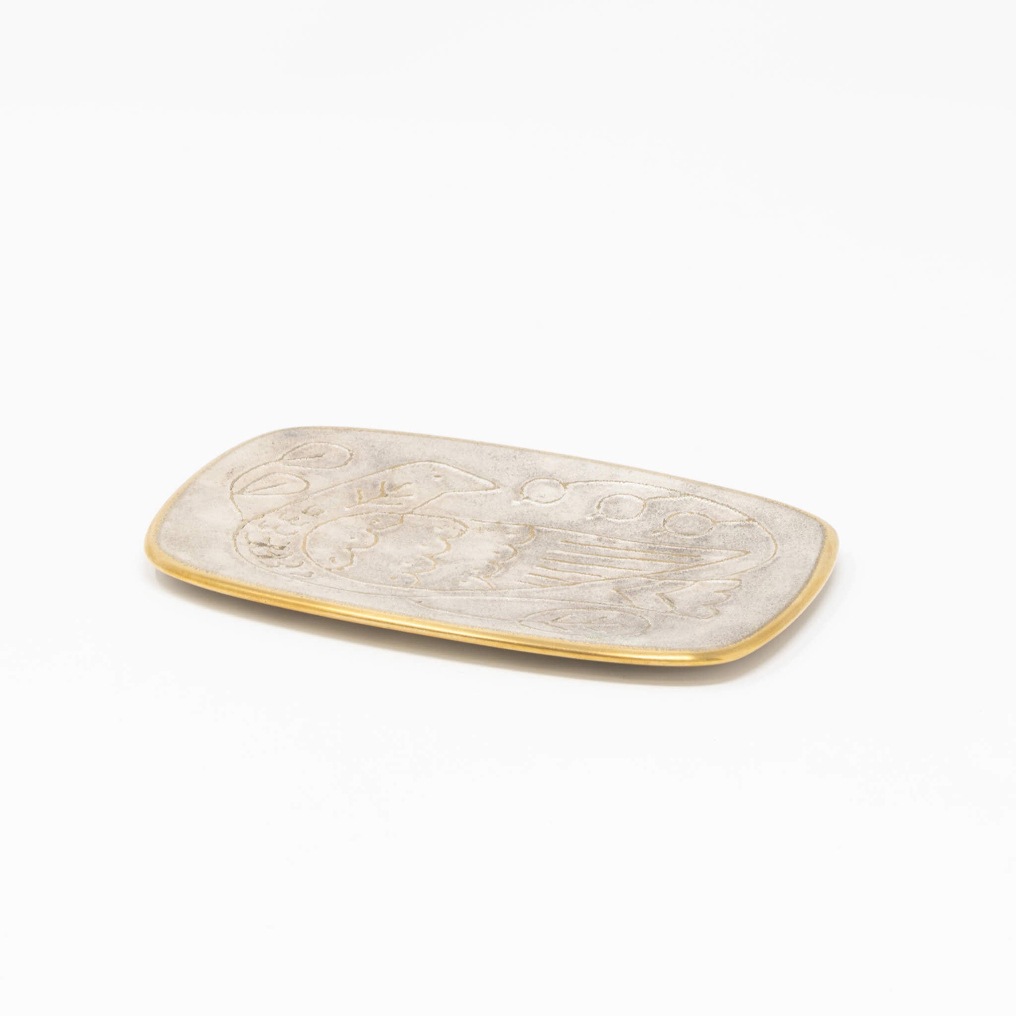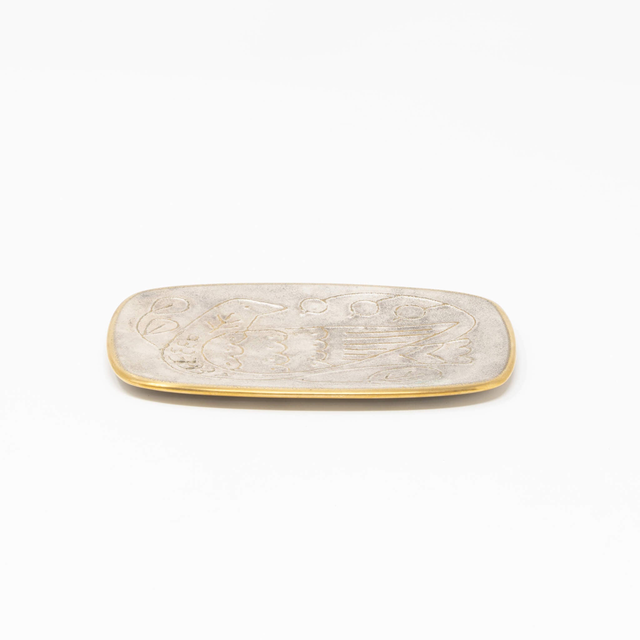 The tray is adorned with a delicate bird motif by a Japanese ceramic artist, adding a refined detail that complements the enduring, natural beauty of brass and makes it a versatile accent for any space.
