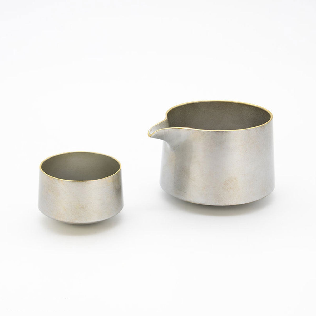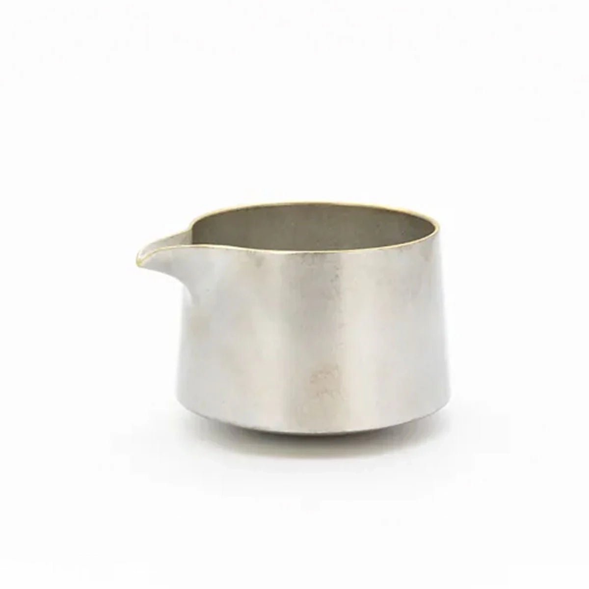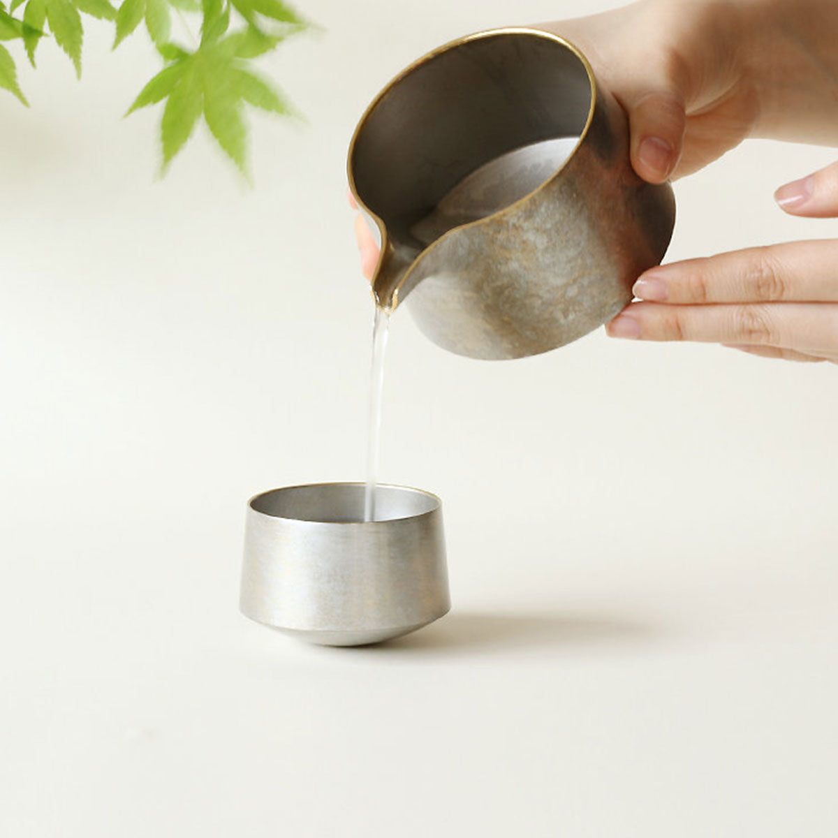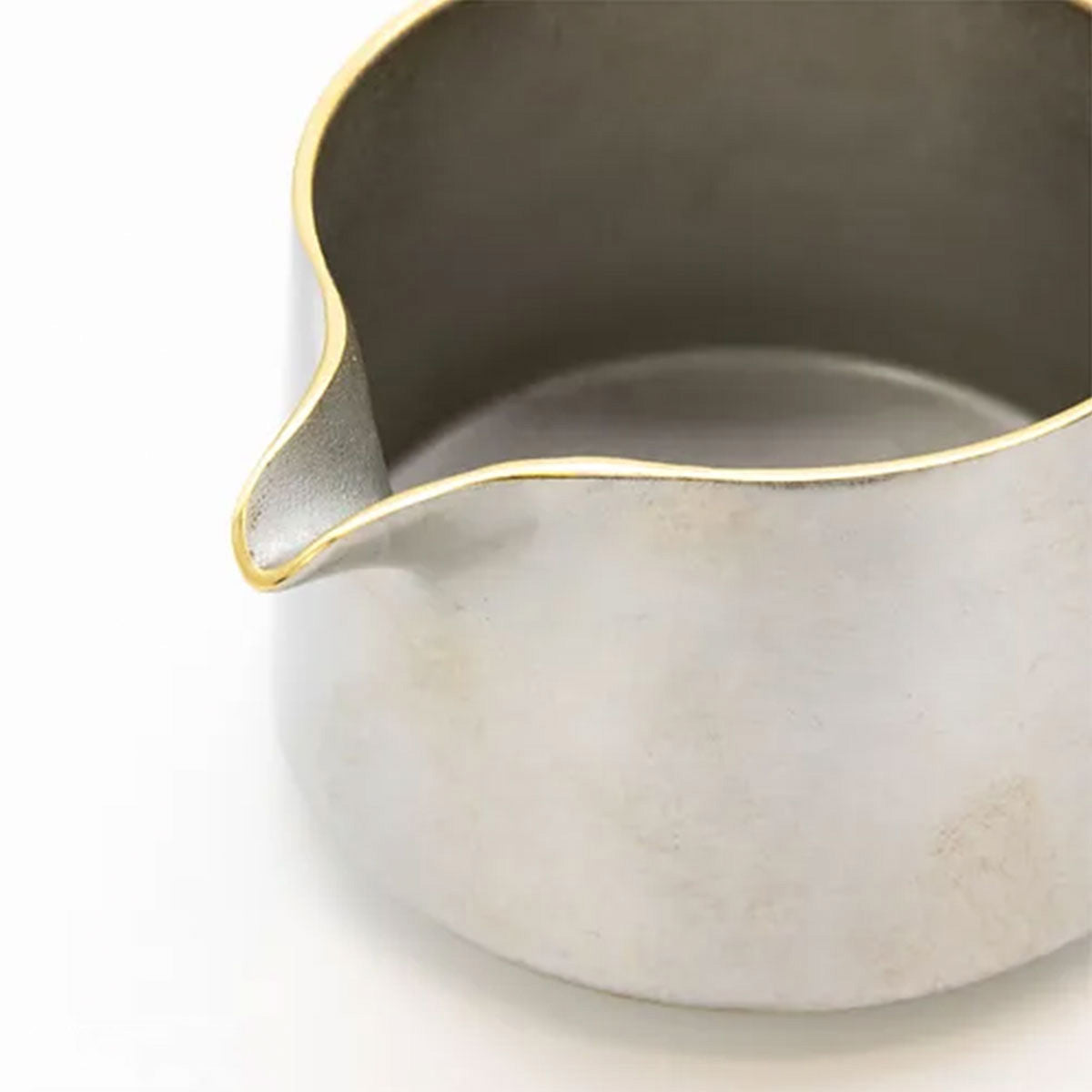 A swinging pouring vessel made of cast copper that gently sways with each pour. Its slightly rounded bottom creates a unique movement, adding an element of fun to your drinking experience. The gold version features a finely textured surface that sparkles beautifully, while the silver version is coated with silver lacquer, giving it a soft, radiant glow. Enjoy this elegant and cherished pouring vessel, a treasure not easily found anywhere else.
