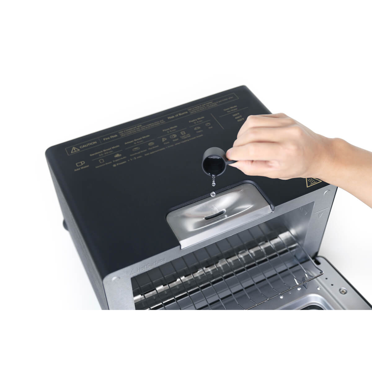 The uniqueness of BALMUDA The Toaster resides in 5 cc of water poured into the toaster at the beginning. Heating more rapidly than air, a thin layer of steam envelops the bread, lightly toasting its surface, while keeping its inner moisture and flavor from escaping.
