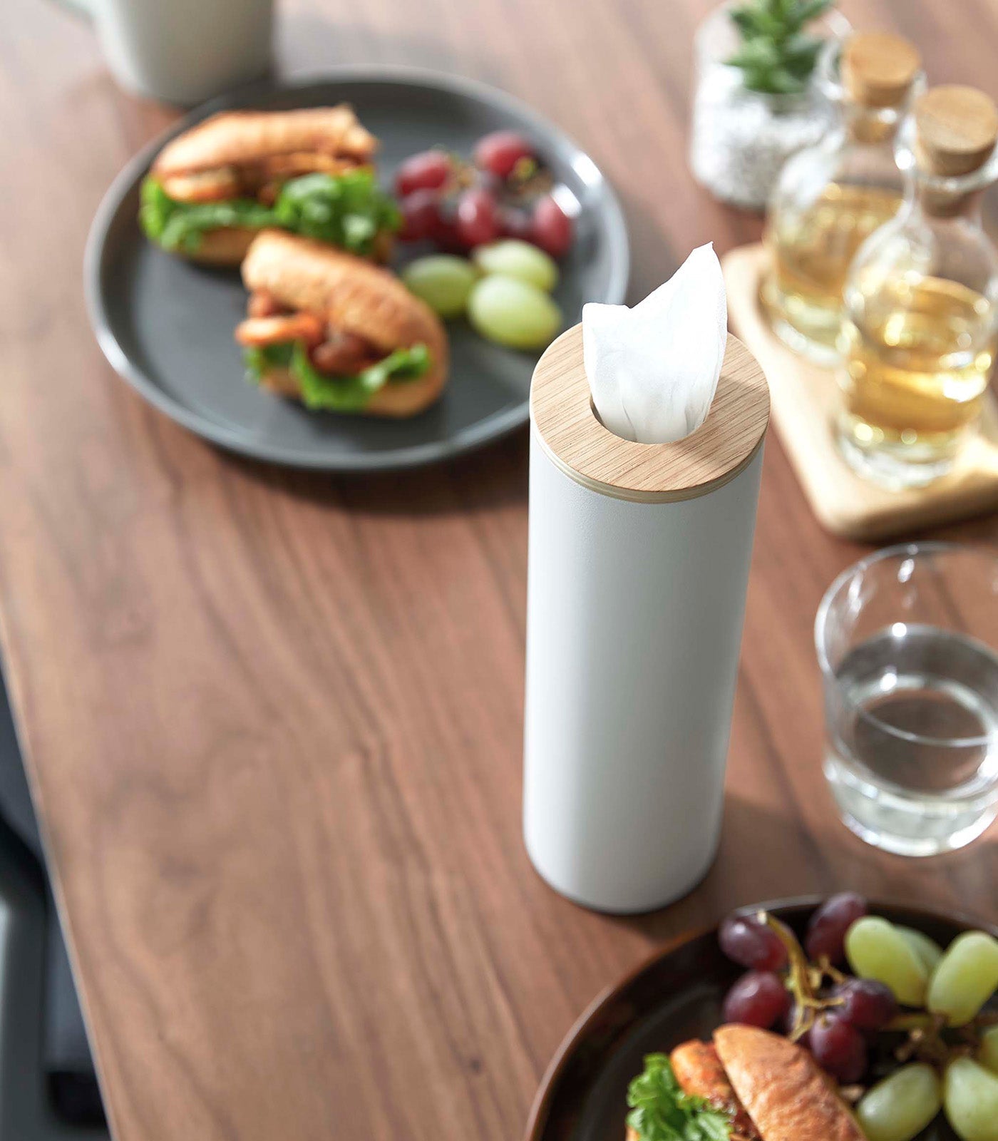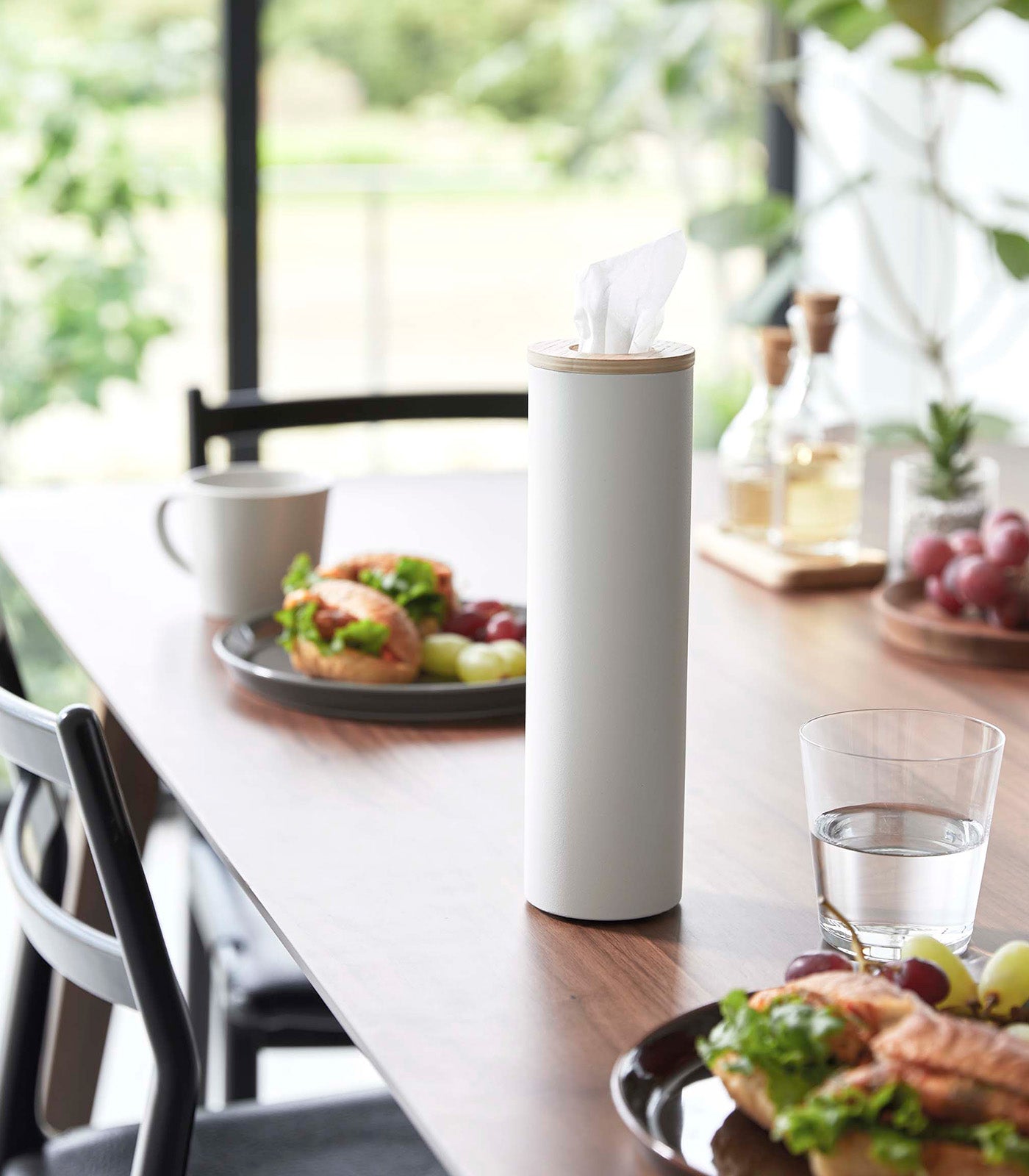 Transform everyday tissues into a luxurious decor item with these slender and modern tissue cases. The sturdy cylindrical steel body allows for extra stability while the silicone seal lining the wooden top keeps the lid in place so tissues can easily be dispensed. All you have to do is roll your tissues into a cylinder and insert them in from the top. Pull the innermost tissue up through the opening, and youβre all set! Keep one on your coffee table, by the sink, on your bedside tableβor if you choose the small version, even insert one in your carβs cup holder for a classy touch.